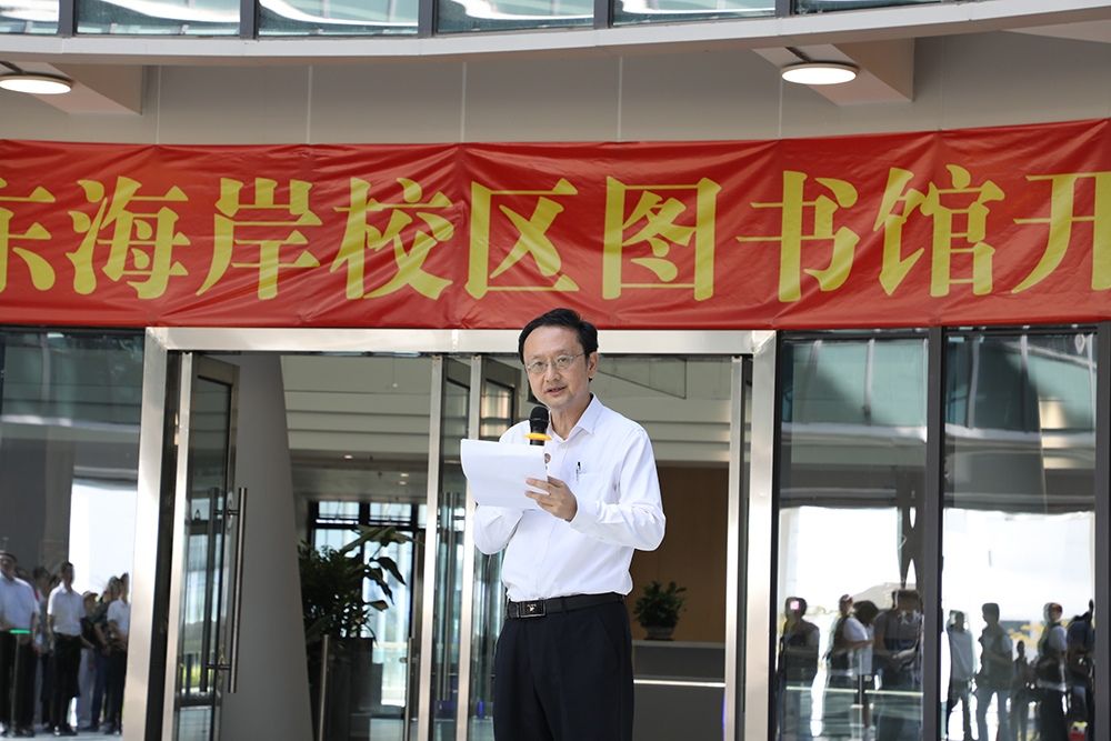 执行校长、汕头大学图书馆工作委员会主任委员王泉院士作开馆致辞。在致辞中,王泉代表学校,向为东海岸图书馆倾注心血的校内各部门同仁表示感谢,向图书馆全体馆员表示祝贺。他指出,总建筑面积3.5万平方米的东海岸校区图书馆,将成为东海岸校区的地标,更将成为汕头大学校园文化的象征。东海岸校区图书馆“智慧之环”的造型与桑浦山校区图书馆“东方书盒”的造型遥相呼应,共同构成了汕头大学继往开来的山海文化叙事。王泉在致辞中介绍,东海岸校区图书馆主楼藏书总容量约120万册,设有2800余个阅览座位。他强调,东海岸校区图书馆内布局的多功能研讨间与静音舱、自助借还系统、智能终端等各类智慧化空间与设施,共同构建了一个“未来学习”的生态系统,将打破传统学科的壁垒,催生面向未来的复合型创新。最后,他殷切希望图书馆始终面向师生、面向知识,恪守“读者第一、服务育人”的初心使命,为学校推动“文理医工融合发展”、建设高水平研究型大学提供最坚实的支撑;鼓励汕头大学的每一位学子,珍惜图书馆这份宝贵的资源,主动探索、积极协作,让书香浸润青春,用阅读点亮人生,在这片知识的海洋里扬帆远航。