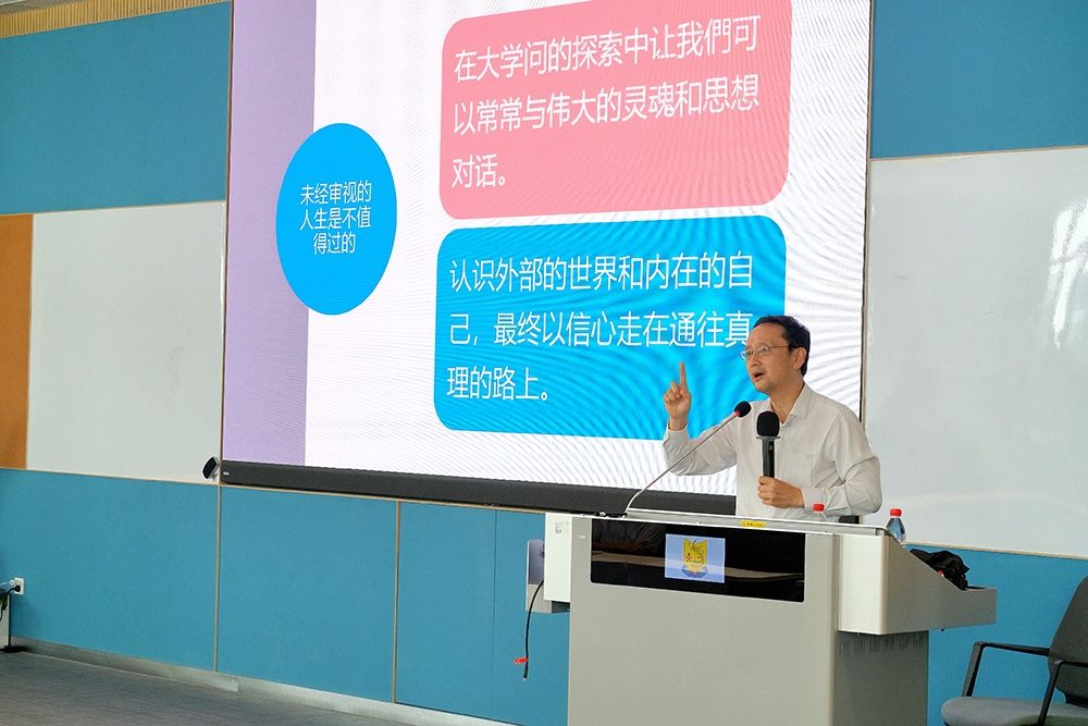 王泉从“何为大学问”“大学问的价值”以及“我们的态度”三个维度带领在场师生探寻大学之问。他指出“大学问就是认识外部世界以及在此过程中形成的对自身的认知。他指出,当历史发展到相应条件时,人类开始对世界(物质和心灵)产生好奇与兴趣,并关注自我与世界的关系,探究世界的运动规律及本质起源,而人类在试图了解外部世界的同时,也开始询问自我存在价值和意义等问题。