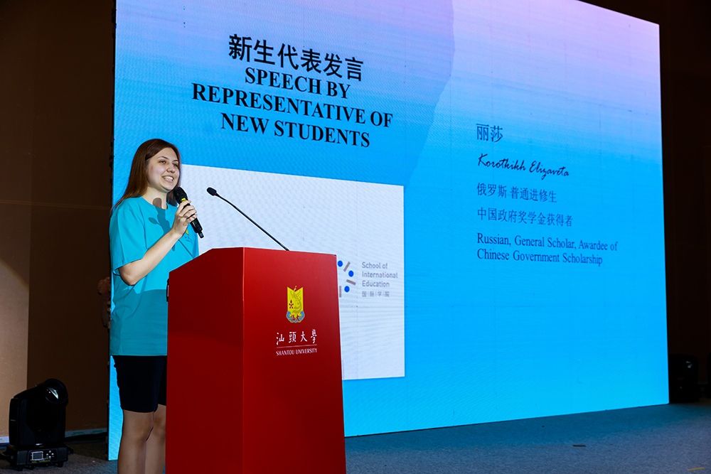 中国政府奖学金获得者、俄罗斯学生Korotkikh Elizaveta(丽莎)代表2025级国际学生新生发言。她表示,选择来汕头大学进修是为了更好地了解中国文化、学习汉语、认识中国朋友。“我非常喜欢校园里的风景,让我感到放松和愉快。老师们也非常有耐心,帮助我克服学习中的困难”她说,“我非常满意在汕头大学的学习和生活,希望能在这里实现我的梦想。”
