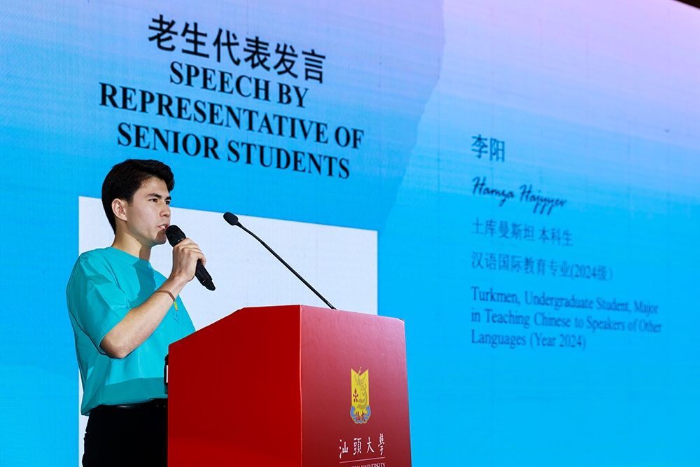 汉语国际教育专业2024级国际学生HAMZA HAJYYEV(李阳)代表在校生作了发言。他向新生们分享了自己选择来汕头大学学习的原因、保持好成绩的小秘诀以及学习中文的好方法。他说:“我很感谢汕头大学给了我这样的机会。这里让我学到很多知识,也让我认识了很多好朋友。我希望在以后的日子里,我可以继续努力,让自己变得更好。”