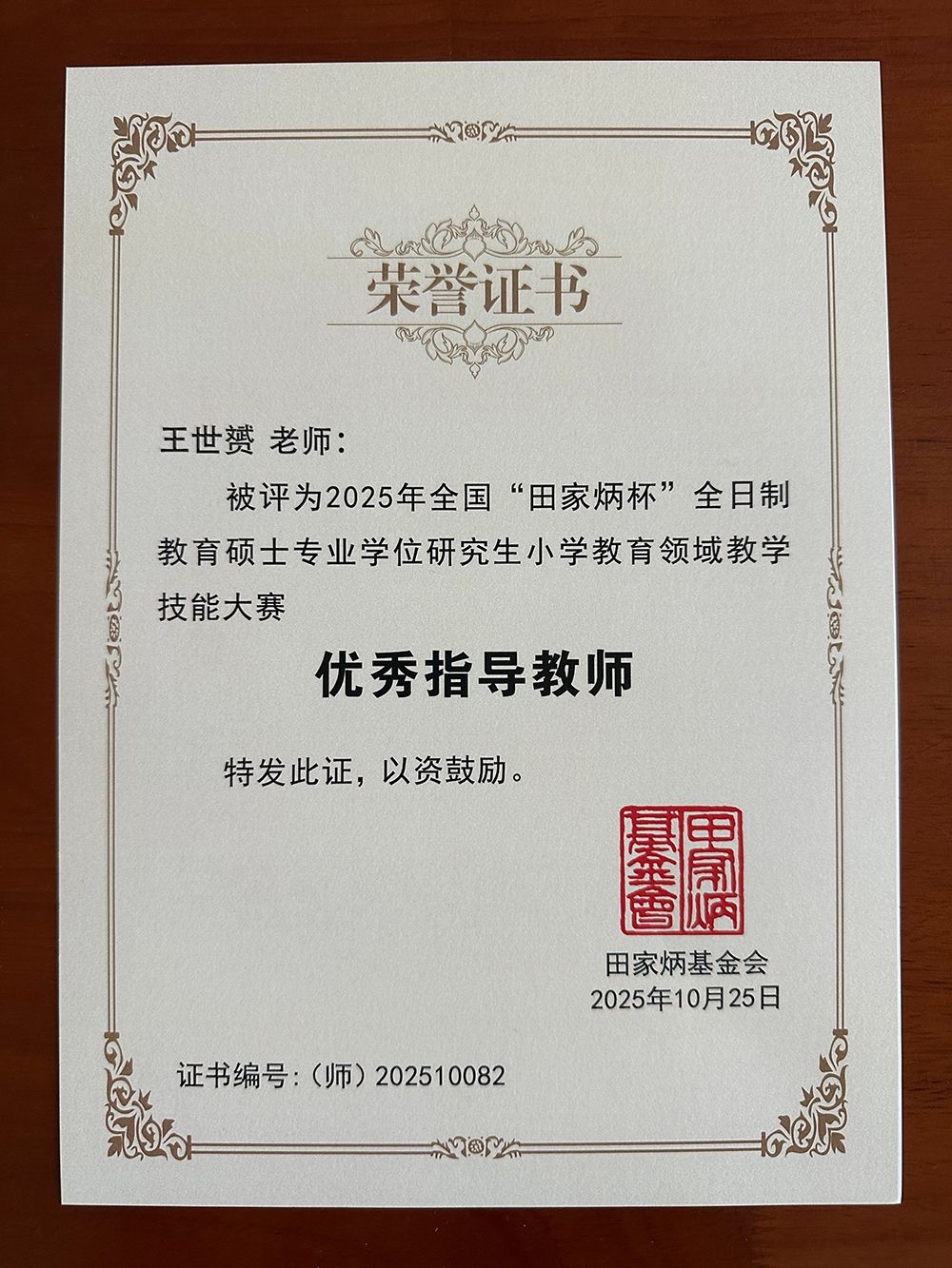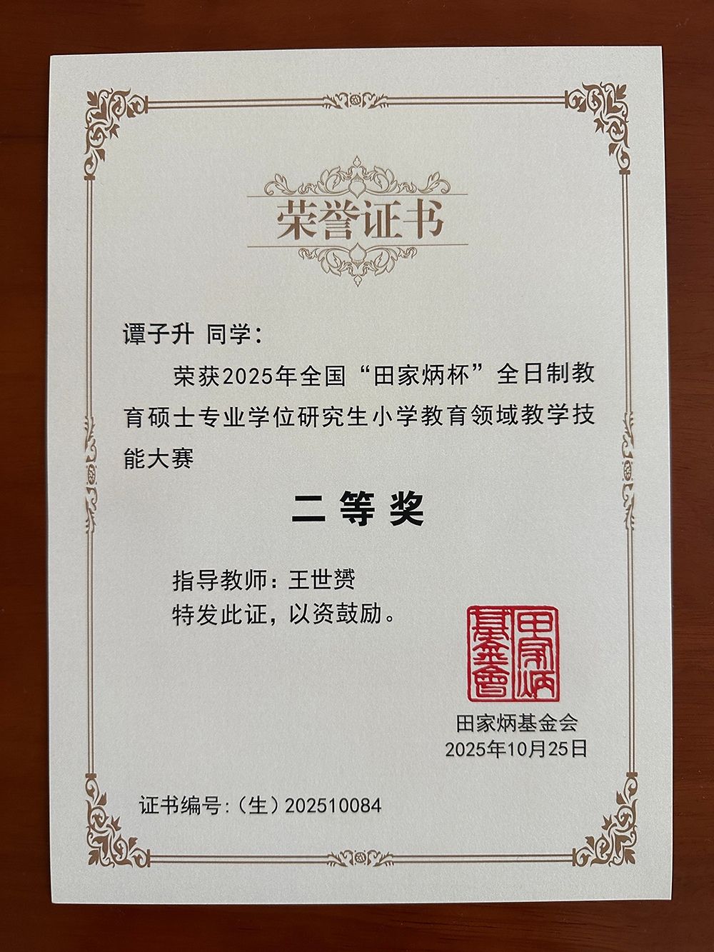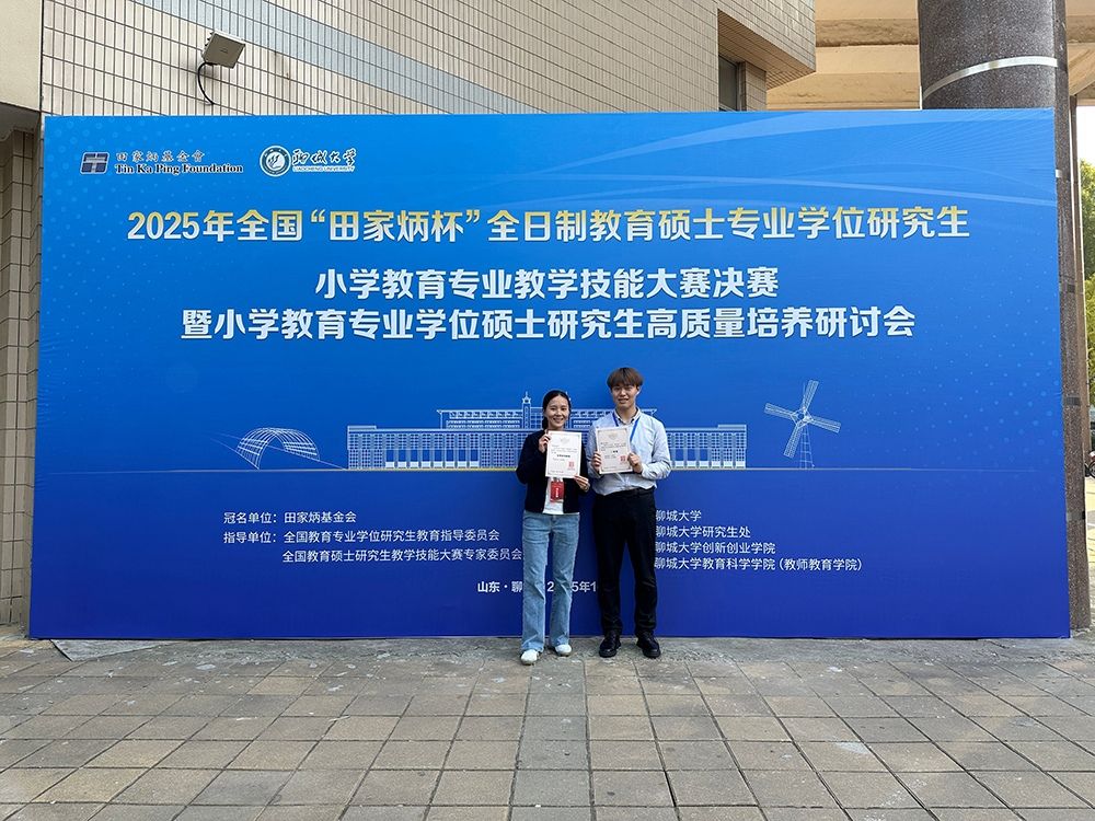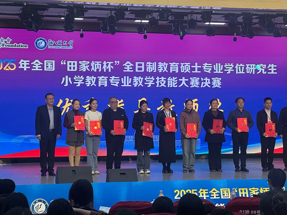 10月25日,2025年全国“田家炳杯”全日制教育硕士专业学位研究生小学教育专业教学技能大赛决赛在山东省聊城大学举行。经激烈角逐,汕头大学法学院高等教育研究所2024级小学教育专业研究生谭子升同学作为学校唯一参赛代表,在小学英语赛道脱颖而出,荣获全国“田家炳杯”总决赛二等奖;王世赟老师荣膺优秀指导教师奖,成功实现学校教育硕士在全国教学技能大赛舞台上零的突破。