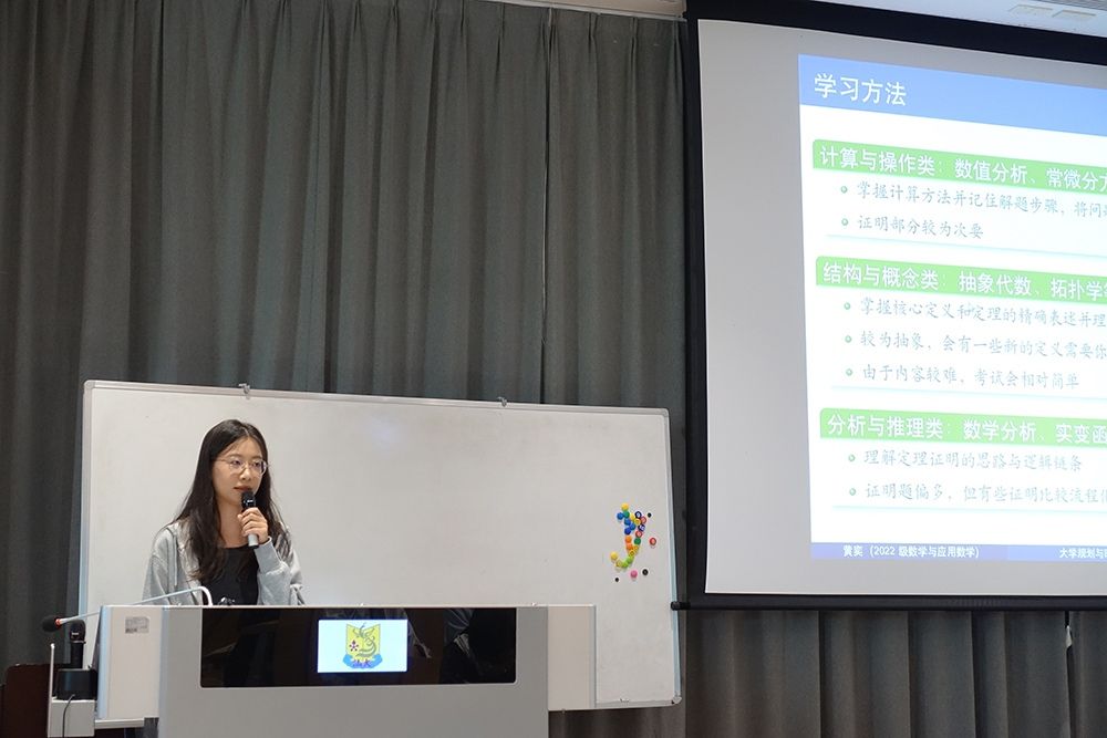 2022级数学与应用数学专业的黄奕同学以“大学规划与时间管理”为主题展开了分享。她建议同学们结合个人未来发展方向,制定有针对性的学业与成长规划,并在日常学习中注重方法分类、时间取舍与团队协作。她特别提醒大家“保持自己的节奏,别被外界打乱”,鼓励同学们在多元探索与专注深耕之间找到属于自己的平衡点。