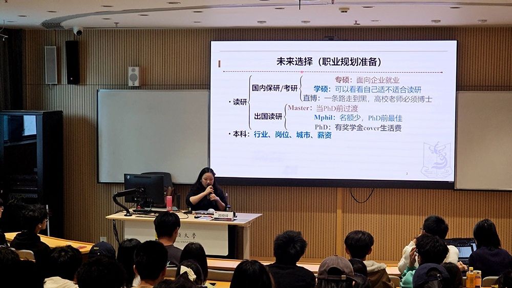 随后,郭晓琦围绕“未来选择”这一核心议题,通过一张清晰的路径图,系统展示了本科阶段可能面临的多元发展路径——全面梳理了读研与就业两大方向及其相应准备策略。她提醒同学们:在本科阶段就要思考自己未来的行业、岗位、城市和薪资预期,尽早明确方向,避免临近毕业时被动抉择。