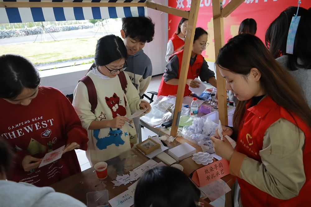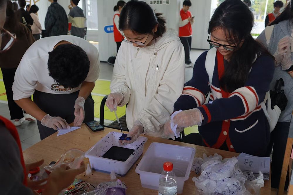 在扎染摊位前,同学们将洁白的方巾反复折叠、用橡皮筋精心捆扎出想要的图案,染料浸润方巾,色彩在织物间自然晕染,每一份作品都因双手的温度而成为独一无二的非遗印记。