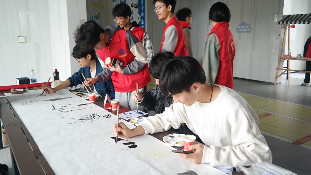 四人成组,共绘素宣长卷。大家轻声讨论布局、互补色彩,不同的风格在宣纸上自然碰撞。顷刻间一幅气韵生动的集体山水画卷渐次成形。画毕,大家自觉清洗笔刷、整理颜料并将工具归位,方便下一组同学继续创作。这份默契让水墨不只停留在纸上,更流淌在协作之间。