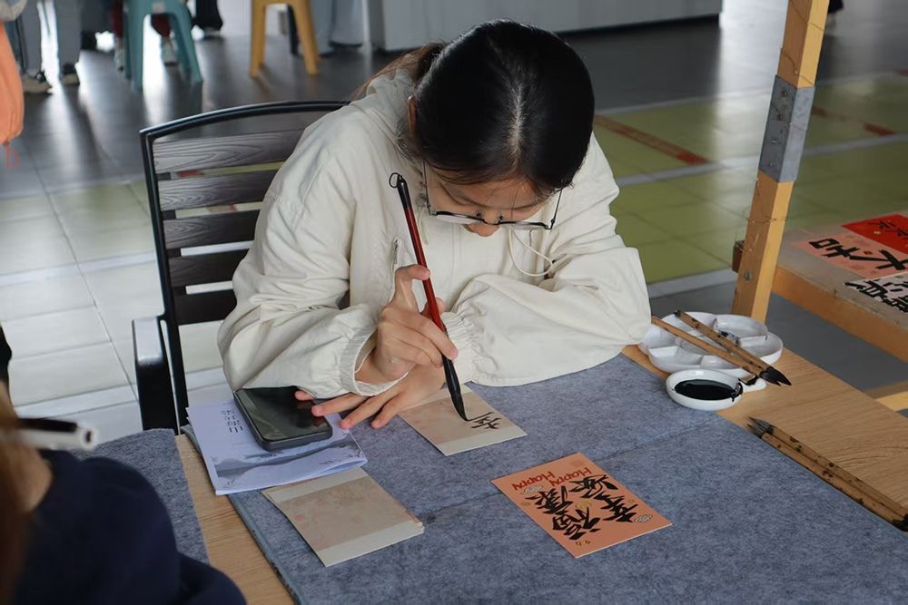 笔墨、砚台与繁体字对照本整齐陈列,同学们提笔写下繁体祝语。墨迹未干,祝福已生。同学们可选择让作品贴上KT板共同展示,或小心卷起,将这一份雅致与祝福打包带走。