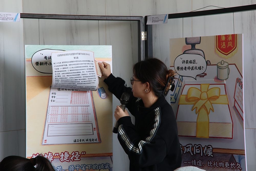 互动装置作品《廉洁清风》带来了更直接的体验。梁蕴祺同学介绍,这组作品设计了三个可翻阅、可打开的互动场景:一个关于“考试诚信”的答题卡,一个关于“拒绝送礼”的礼物盒,以及一个关于“职场拒礼”的镜面装置。“当观众翻开、打开这些部件,完成互动时,才能看到核心信息。我们希望廉洁不是一句口号,而是能融入日常行为的选择。”创作中,从手绘到零件制作的重重挑战,让小组对“廉洁”的理解愈发深刻。