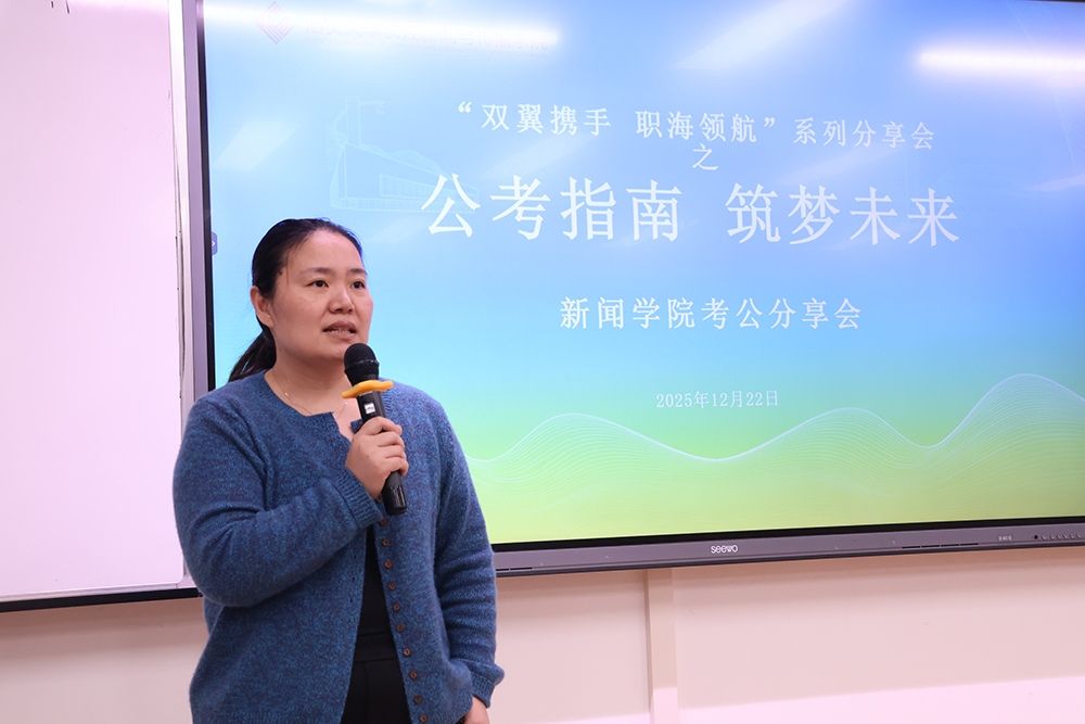 2025年12月22日下午,长江新闻与传播学院“公考指南·筑梦未来”考公经验分享会在东海岸校区举行。活动邀请税务系统公职人员邵润嘉、周斐颖等两位校友返校,为有考公意向的学子分享备考与选岗经验。学院团委副书记朱慧斌出席分享会。